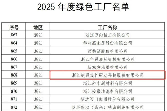 近日,捷昌驱动接连获得国家级权威认可,高质量发展成色十足。公司先后被确定为国家知识产权示范企业创建对象,并成功入选工业和信息化部2025年度国家级绿色工厂名单。“创新驱动”与“绿色智造”成为引领其发展的双核心引擎。