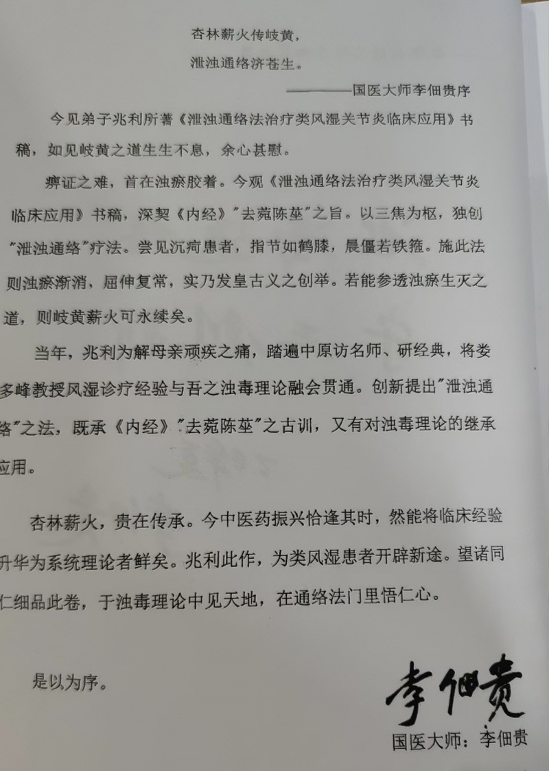 国医大师李佃贵教授给弟子王兆利新书《泄浊通络法治疗类风湿关节炎临床应用》作序并合影留念