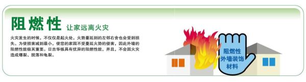 火灾发生的时候,不仅仅是起火处,火势蔓延到的左邻右舍也会受到损失。为使损害减到最小,使您的家园不受蔓延火势的侵害,因此外墙的阻燃性能极其重要。日吉华板具有优异的阻燃性能,并且,不会因火灾造成爆裂、脱落和龟裂。