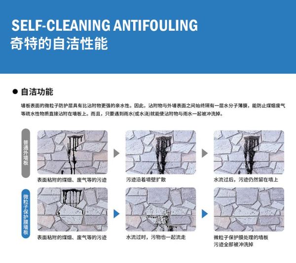 墙板表面的微粒子防护层具有比沾附物更强的亲水性。因此,沾附物与外墙表面之间始终隔有一层水分子薄膜,能防止煤烟废气等疏水性物质直接沾附在墙板上。而且,只要遇到雨水(或水浇)就能使沾附物与雨水一起被冲洗掉。