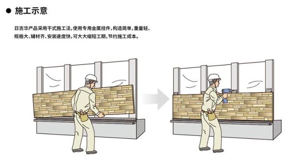 日吉华产品采用干式施工法,使用专用金属挂件,构造简单,重量轻、规格大、辅材齐,安装速度快,可大大缩短工期,节约施工成本。