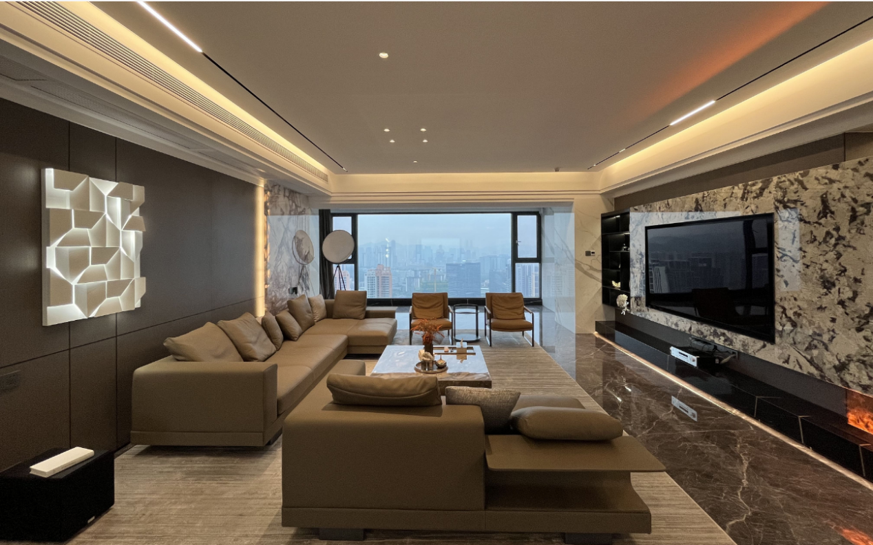 全屋以奶油色为主色调,那清淡的姿态赋予空间一种绵软又轻盈的独特质感。原木元素悄然融入其中,为家增添了一份温润的气质,还巧妙地划分出空间层次。客厅基调简单有序。浅色墙面与带有岁月肌理的地板奠定了基础,两组大面积收纳柜将书籍和线路设备有序藏于其中,呈现出整洁统一的视觉效果。阳光透过窗外摇曳的植物倒影,为静谧空间增添了灵动生机。