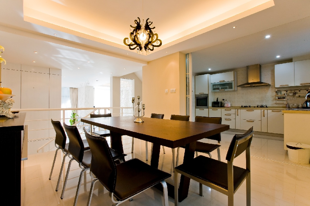 客餐厅采用开放式空间设计,低饱和度色彩与不锈钢材质的运用,为房屋带来多层次的感官体验。在满足功能需求的基础上,营造出放松舒展的生活环境。餐边储物、洞石与墙体结合,形成独特的体块关系。厨房选用干净色调与木色自然纹理,与餐客厅无缝衔接。阳台具备洗衣晾晒功能,折叠门可在需要时将其划分为独立空间。