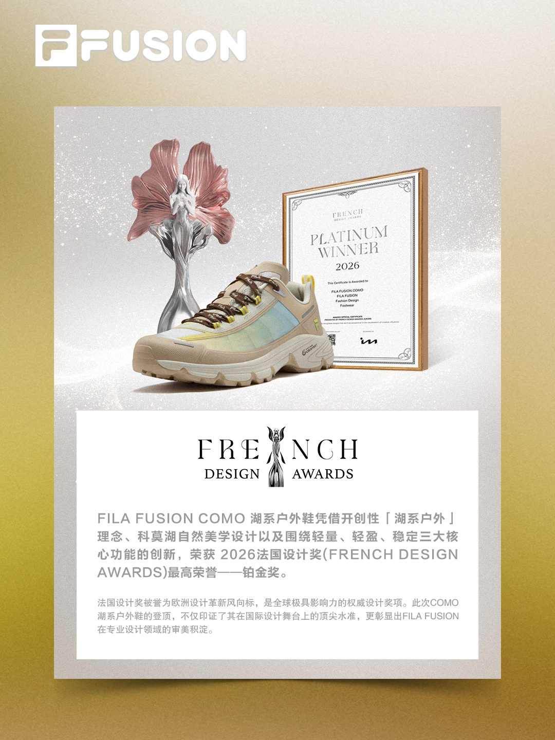 凭借对 “湖系户外(Lake Vibe)” 概念的深度演绎,COMO 一举斩获2026法国设计奖(French Design Award)—— 铂金奖。作为国际设计领域极具影响力和权威性的标杆奖项,法国设计奖致力于表彰全球最具创新精神与前瞻视野的杰出作品。此次加冕铂金奖,充分印证了 COMO从设计与功能两大维度,全面重塑了轻户外鞋履标准。