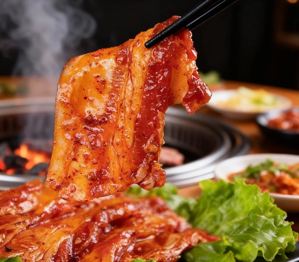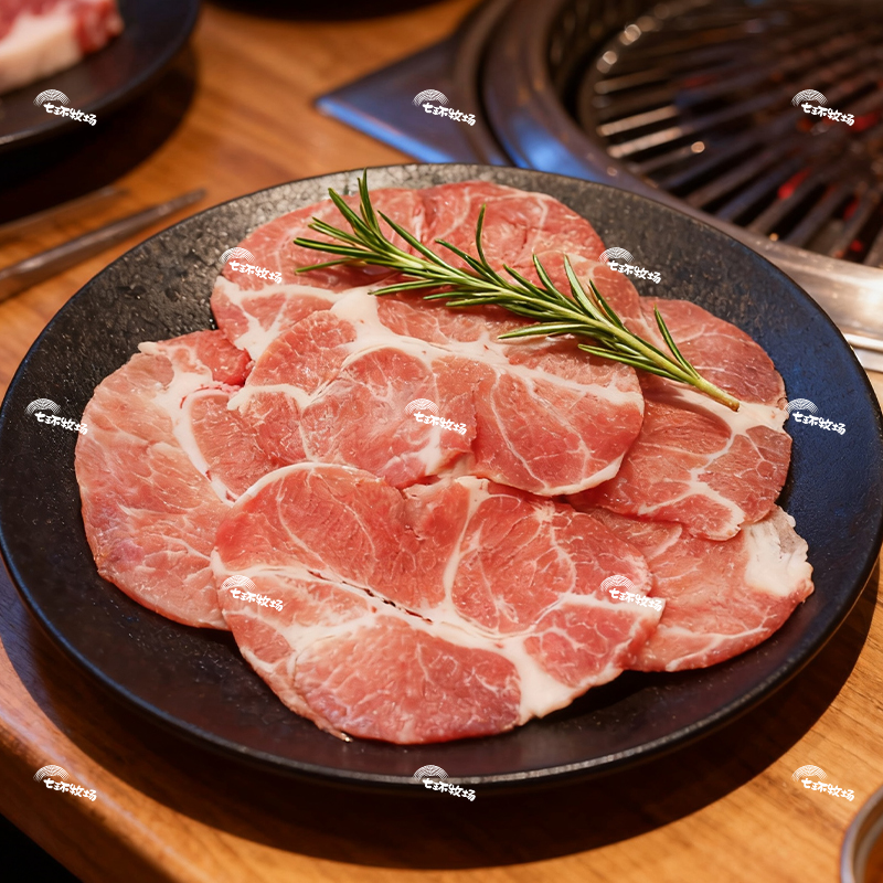 原切五花肉片肥瘦黄金配比,纹理均匀,烤制后油脂香气四溢,外焦里嫩;