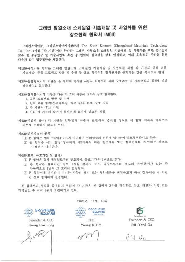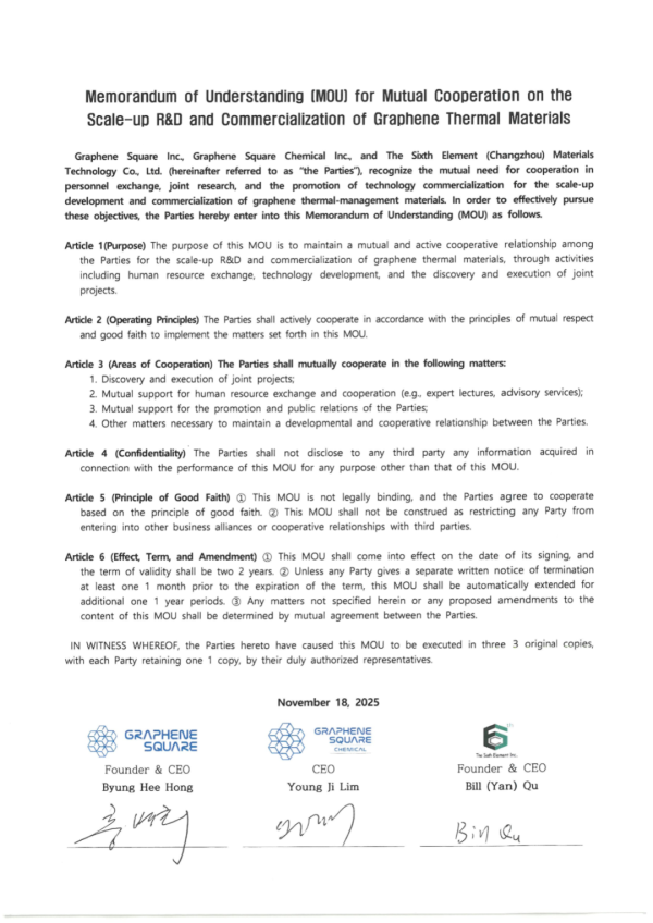 2025年11月18日,第六元素与韩国Graphene Square旗下两家公司正式签约,达成石墨烯材料研发及商业化战略合作,共拓石墨烯在韩国市场的商业化应用。
