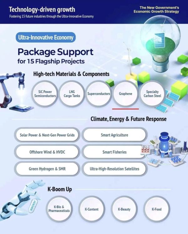 韩方政府在最新五年经济增长战略计划中,将石墨烯等尖端材料列为“国家战略技术”,不仅通过浦项市《石墨烯产业培育规划》拟打造全球首个纳米新材料集群,还配套万亿韩元产业基金、研发税额抵扣等政策,重点推动其在消费电子、新能源等领域的商用化。