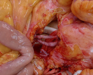 然而,本次手术的最大亮点与挑战,在于团队创新性地应用自体大隐静脉进行肠系膜动静脉桥接重建。针对患者特殊的肠系膜血管病变与缺损,该技术有效恢复了肠道血流,为IPAA手术的成功实施创造了关键条件。经检索,该术式为全国首例、世界第三例成功报道。